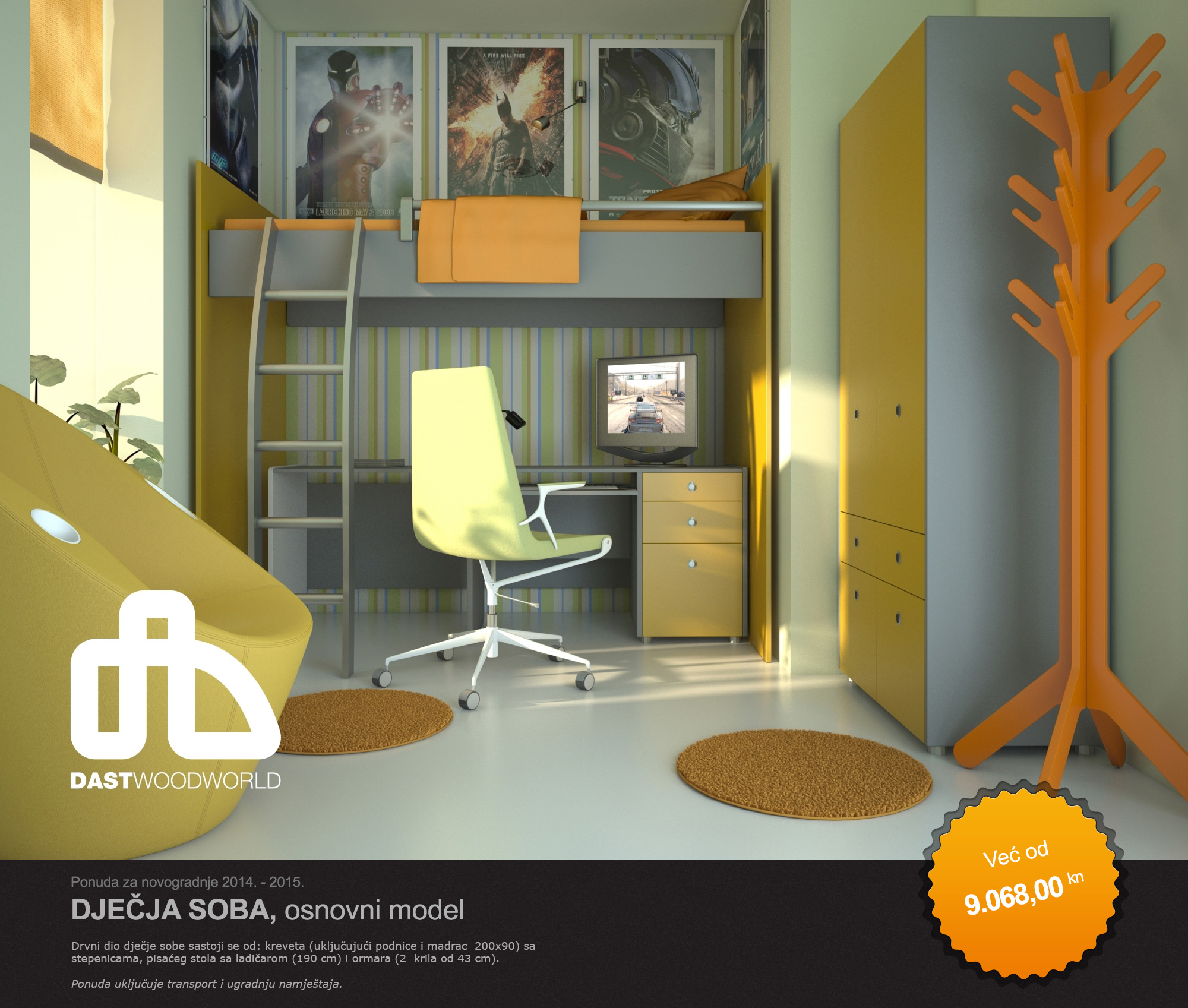Drvni dio dječje sobe sastoji se od: kreveta (uključujući podnice i madrac 200x90) sa stepenicama, pisaćeg stola sa ladičarom (190 cm) i ormara (2 krila od 43 cm). Ponuda uključuje transport i ugradnju namještaja.